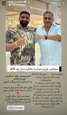 به گزارش جهان مانا ، هادی چوپان که به تازگی در مسابقات مسترالمپیا ۲۰۲۵ به مقام نایب قهرمانی رسیده است در آمریکا با سیاوش شمس خواننده ایرانی - لس آنجلسی دیدار داشته است.